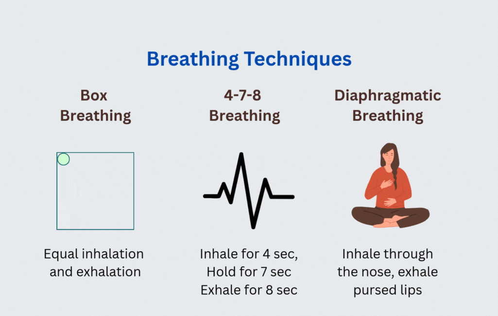 Diaphragmatic breathing: Lie on your back, place one hand to upper chest and another to rib cage. Inhale through the nose while feeling your stomach, and slowly exhale using pursed lips. Here is a guided video illustration about diaphragmatic breathing.