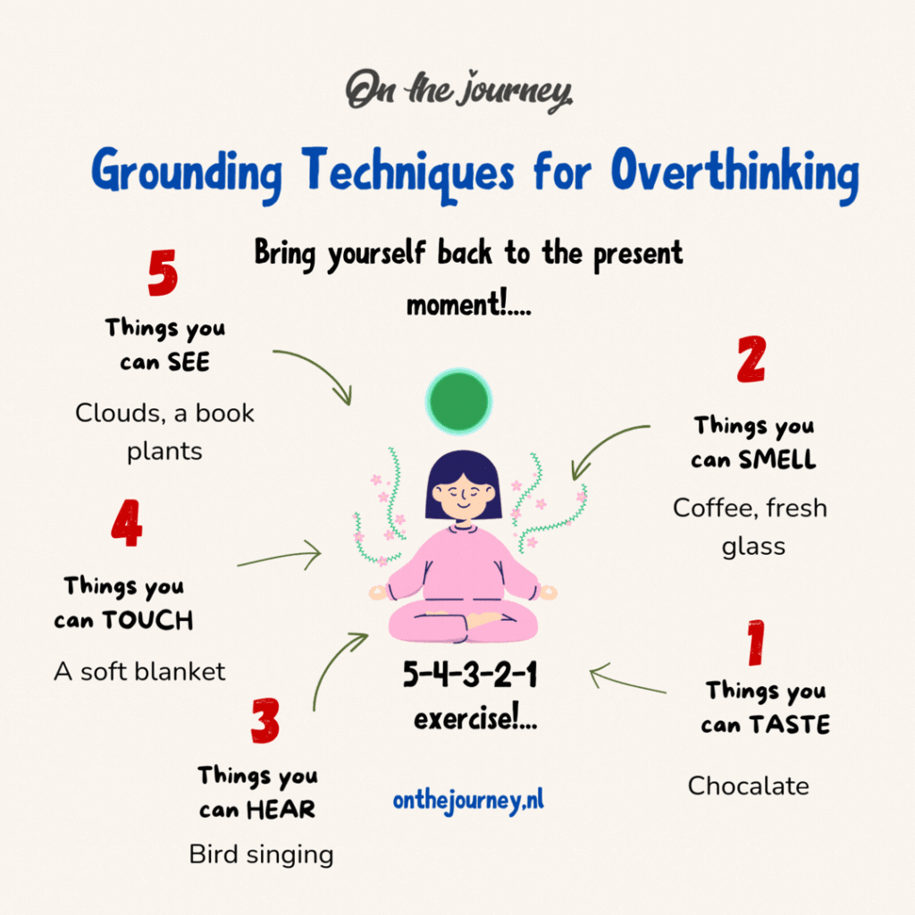 A practical strategy to interrupt the cycle of overthinking is grounding technique, to bring the attention back to the present moment. When someone becomes overwhelmed by racing thoughts, grounding helps anchor the mind in reality using the senses, physical movement, or focused breathing. A common method is the 5-4-3-2-1 technique, which involves identifying things you can see, touch, hear, smell, and taste. Other grounding practices include deep diaphragmatic breathing, feeling your feet on the floor, or holding a textured object to redirect mental energy.