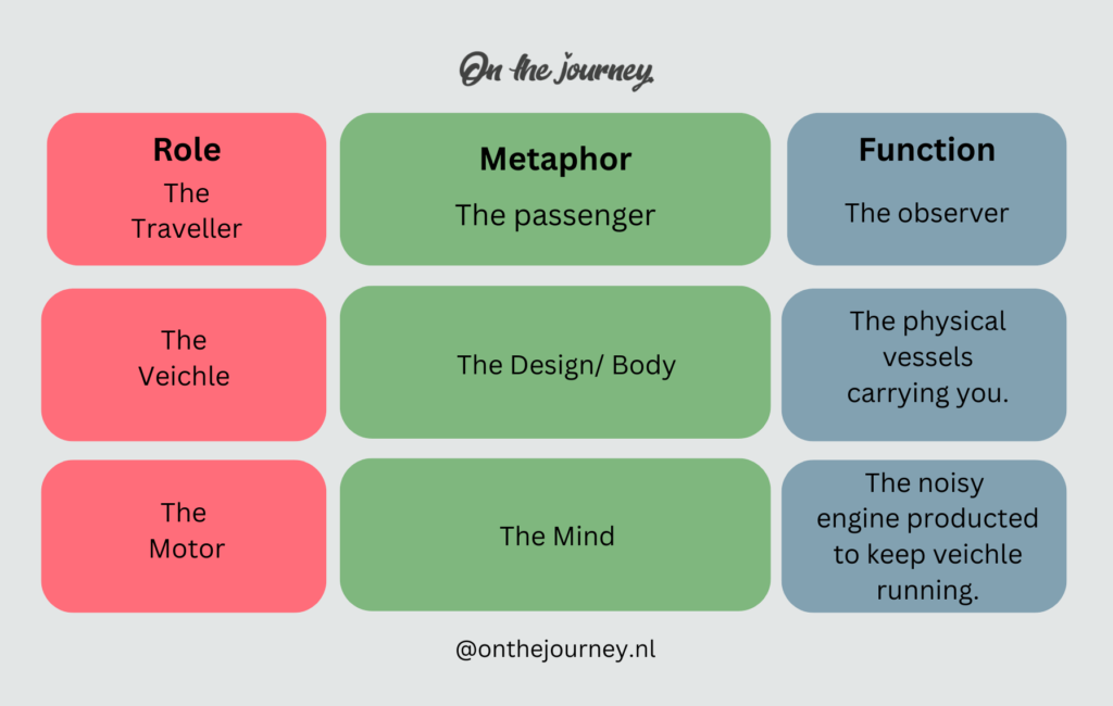 The mind creates thoughts automatically all day long without a break and 95% of this is conscious. You have tendency to hear the noise of the engine which is a random thought that could evoke anxiety. You are the inhabitant of the thoughts themselves. The author explains this with a metaphor, you are the passenger, your body is the vehicle and your mind is the motor.